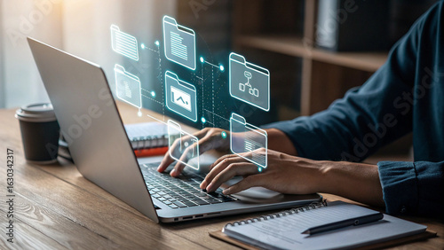 technology, computer, laptop, datum, digital, information, network, connection, file, folder, organisation, management, storage, cloud, database, analysis, business, office, work, workspace, desk, hand, typing, keyboard, screen, interface, user, person, male, modern, futuristic, holographic, visualisation, graphic, icon, document, online, cyberspace, software, application, system