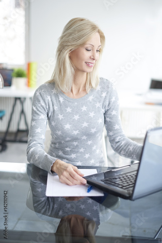 Working on new project. Shot of an attractive smiling financial businesswoman working on laptop in the office.