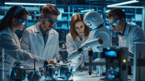 Working with Robotics Engineers on a Robot Arm Project in a Scientific Technology Lab. Young Team Developing AI Robotic Arm in an Industrial Facility.