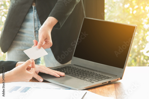 working woman are working at coffee shop they use mobile phone to search data about they's work from social network and they have laptop , papers graph and note to help for work put on wooden table.
