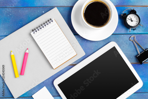 Workplace with blank digital tablet, paper on blue wooden work table. Above view shot