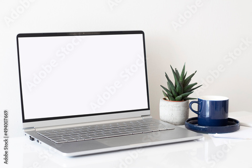 Workspace desk, plant, laptop and coffee cup. Business image, Blank screen computer and supplies. laptop mock up screen view. work from home concept