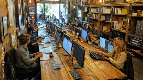 workspace, interior, office, people, working, computer, collaboration, startup, community, design, wood, table, desk, monitor, digital, technology, business, urban, cafes, hot drink, shop, creative, professional, individual, learning, focused, productive, employee, meeting, discussion, communication, remote, bustling, modern, innovative, generation, entrepreneur, success, inspiration, education, innovation, development, project, progress