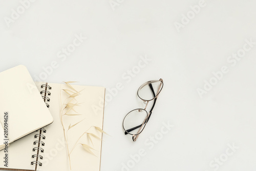 Workspace with blank notebook, dried flowers and glasses. Stylish office desk. Autumn or Winter concept. Flat lay, top view. Blogger or freelancer decktop
