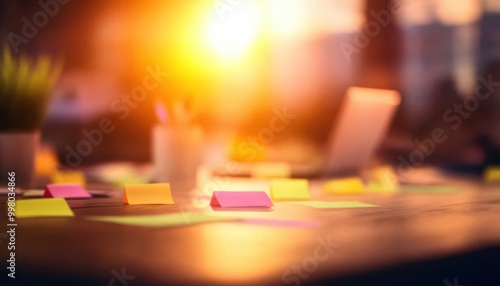 Workspace with sticky notes and laptop, warm sunlight in soft focus.