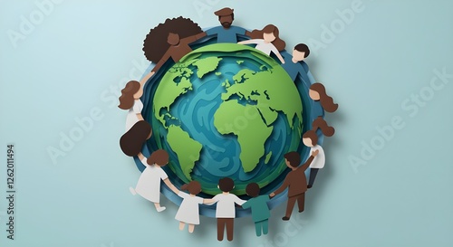 World Earth Day concept featuring a paper cut illustration from above showing a people hugging a colourful green globe on the left. no text