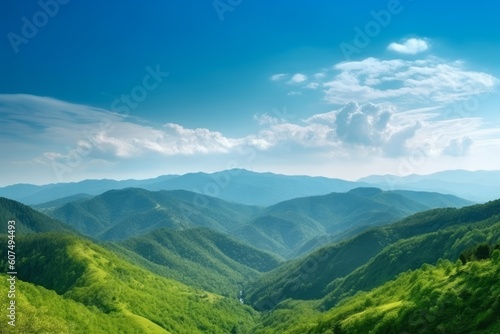 World Environment Day concept: Green mountains and beautiful sky clouds under the blue sky, Generative AI