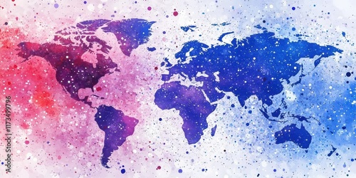 World map, colorful paint splatters, abstract art, vibrant watercolor, global continents, artistic cartography, splatter effect, blue and purple hues, dynamic composition, creative geography, fluid te