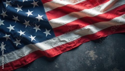 Worn American flag detail, stars and stripes fabric waving gently. Background shows dark textured surface with subtle grunge effect. Patriotic background for remembrance, honor, or national holidays.