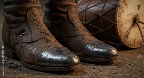 Worn leather boots with steel toes