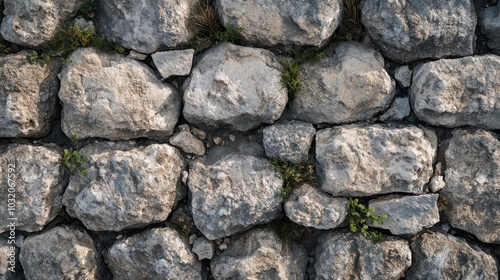 Worn mortar between fortress stone blocks plants growing in cracks stones uneven and rough