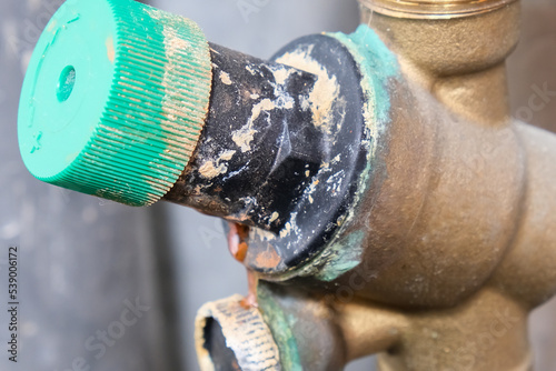 Worn woter supply equipment, leaking corroded water flow regulator, reducer, plumbing repair concept