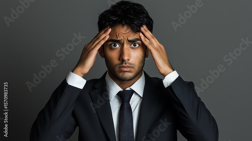 Worried South Asian man in a suit with hands on his head, expressing stress or anxiety.