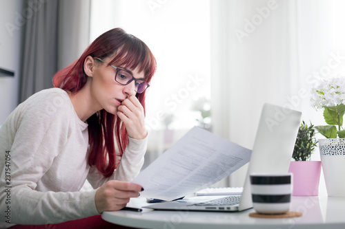 Worried woman at home checking financial documents using calculator and laptop