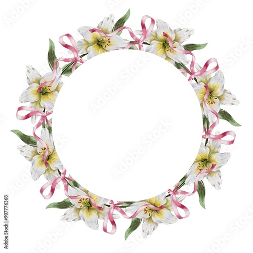 Wreath frame of white lilies and pink ribbons bows watercolor illustration.. For decorating cards, weddings, birthdays, invitations