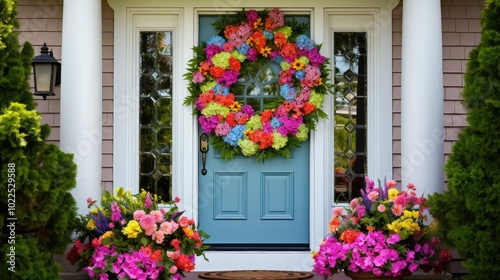chaplet, spring, front, door, illustration, flower, greenery, vibrant, colourful, entrance, welcome, decor, seasonal, bloom, fresh, nature, cheerful, inviting, floral, out, porch, renewal, bright, lively, festive, charming, decorative, garden, home, style, accent