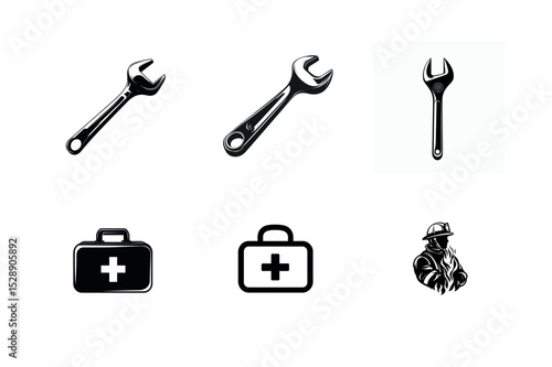wrench, spanner, tool, tool, icon, icon, first aid, first aid kit, medicals, emergency, safety, firefighter, fireman, fire, rescue, help, service, repair, maintenance, equipment, graphic, design, silhouette, black-and-white, vector, illustration, symbol, symbol, set, collection