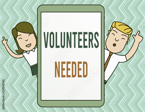 Writing note showing Volunteers Needed. Business concept for need work or help for organization without being paid Male and Female Index Fingers Up Touch Screen Tablet Smartphone Device