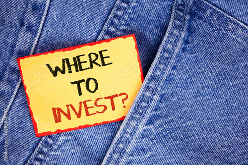 Writing note showing Where To Invest Question. Business photo showcasing Right Place Stock Share to spend your savings in written Sticky Note Paper the Jeans background.