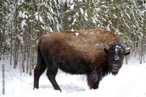 antler, bison, brown, buffalo, cold, foliage, forest, fur, hairy, horn, horned, huge, imposing, sightseeing, snow, tour tourism, wildlife, winter, wyoming, yellowstone national park