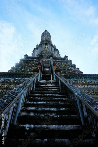 Wysoka wieża od świątyni. Tajska świątynia i schody prowadzące na wieżę.