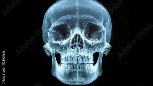 skull, x-ray, human, bone, head, anatomy, medicals, health, science, radiography, image, scan, photo, forensic, death, danger, dark, light, blue, shadow, transparent, detail, structure, teeth, jaw, face, skull, lower jaw, orbit, frontal, temporal, occipital, nasal, palatine, cervical, vertebra, brain, nervous, skeleton