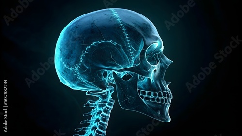 skull, x-ray, transparent, human, skeleton, bone structure, anatomy, medicals, illustration, spine, vertebra, cervical, head, profile, half face, glowing, blue, black background, health care, medicine, science, biology, skeletal, bone, skull, lower jaw, occipital bone, temporal bone, suture, teeth, neck, spinal column, axis, atlas, bod, body, internal, structure, visible, detailed, scientific, research, education