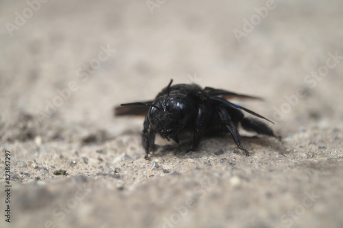 Xylocopa valga. Big black bee on the ground close-up. Carpenter bee