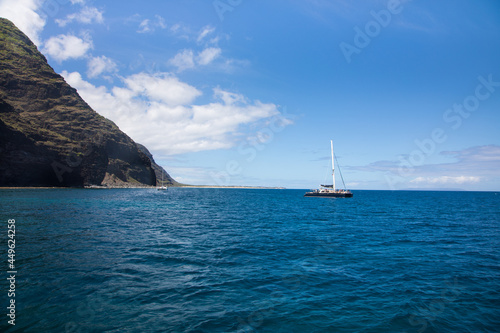 yacht, touring, coast, coastline, sightseeing, travel, kauai, boat trip, blue, vacation, boat, tranquil, cliff, ocean, island, holiday, landscape, tour tourism, hawaii, journey, rock, sea, seascape, stone, summer, water