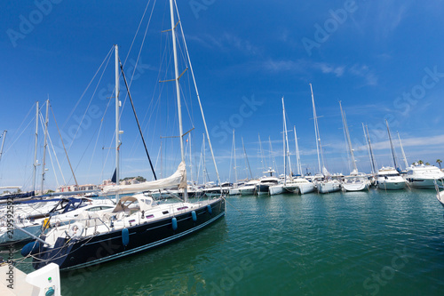 Yachts in the harbor on a sunny day. Copy space