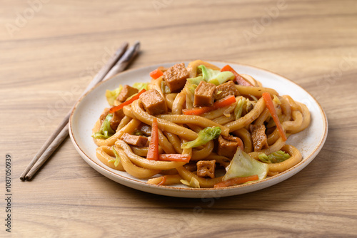 Yaki Udon, Stir fried udon noodles with tofu, carrot, cabbage and mushroom, Japanese cuisine, Asian vegetarian food