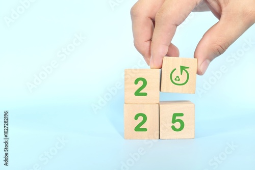 Year 2025 sustainability goal and sustainable development target concept. Wooden blocks with ecological environment icon.