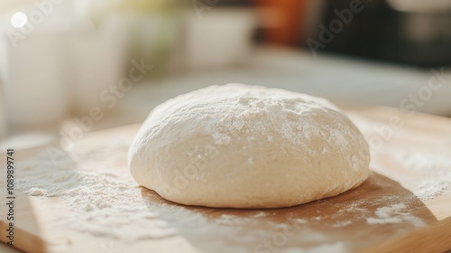 Yeast dough rising on a floured wooden surface with sunlight highlighting its texture and form ready for baking