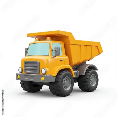 Yellow 3D cartoon toy dump truck with large cargo bed, isolated on white background for construction and transport design