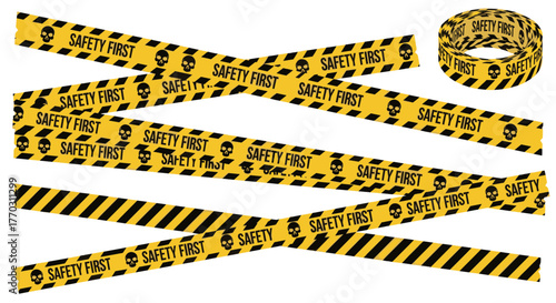 Yellow and black caution tape with 'SAFETY FIRST' text and skull symbols, along with striped hazard tape, indicating a warning or restricted area.