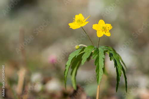 Yellow anemone (Anemone ranunculoides) or yellow wood anemone or buttercup anemone, woodland and forest plant with root-like rhizomesand petal-like tepals of rich yellow colouring. Family Ranunculacea