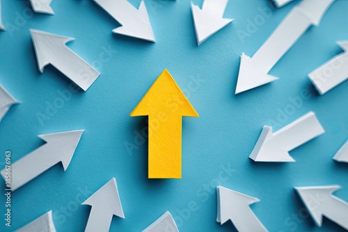 arrow, yellow, white, direction, upwards, challenge, contrast, unique, different, individuality, leadership, choice, blue, background, pointing, navigation, success, sharpened, strategy, guidance, symbol, target, goal, inspiration, ambition, progress, decision, opportunity, path, way, route, perspective, alternative, movement, up, contrary, opposition, bold, strong, motivation, potential, forward, distinct, standout, aiming, achievement