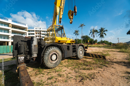 Yellow automobile crane with risen telescopic boom outdoors. Mobile construction crane on a constructin site. Crane machine stand by waiting for work under the construction building. Heavy industry.