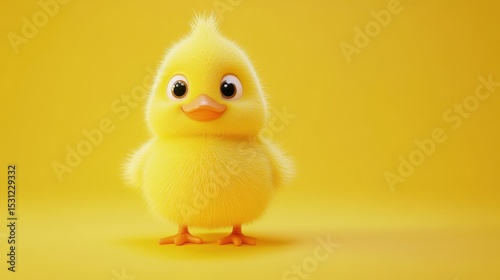 chick, standing, yellow background, fluffy, easter, happy, cute, bird, cartoon, cheerful, background, studio, soft, feather, small, adorable, character, spring, joyful, playful, simple, bright, light, egg, toy, vibrant, minimal, digital artwork, isolated, gradient, whimsical, childhood, commercial, greeting card, print, illustration, web design