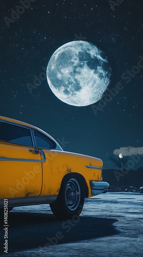 Yellow classic car with the moon illuminating the night sky