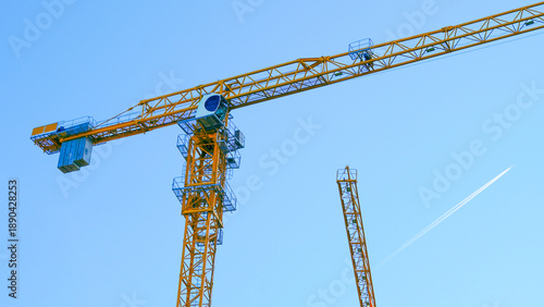 crane, construction, yellow, blue, sky, jet, condensation trail, machinery, industrial, equipment, metal, structure, lifting, tower, urban, architecture, engineering, daylight, high, elevated, support, framework, cable, beam, horizontal, vertical, infrastructure, site, safety, men at work, platform, load, transport, aerial, technology, modern, design, construction site, skyline