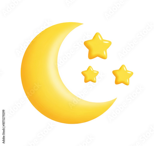 Yellow crescent moon and stars, night sky, isolated on black background