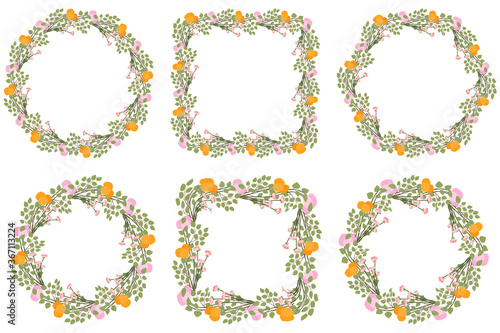 Yellow dandelion, pink rose, lilac, leaf branch wreath. Floral design. Botanical frame collection. Vector set.