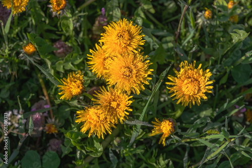 Yellow dandelions in the green grass on a sunny morning. Dandelion in the grass. Spring Greens. Spring mood. Close-up. Selective focus.