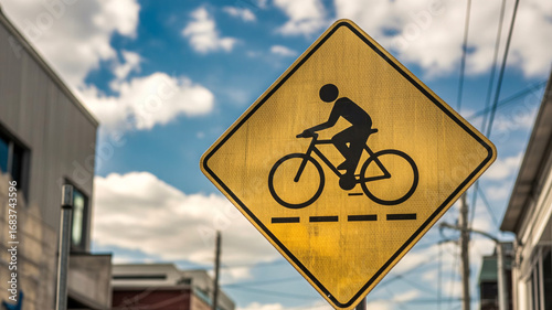 Yellow diamond cyclist warning sign against a bright blue sky with fluffy clouds and urban buildings