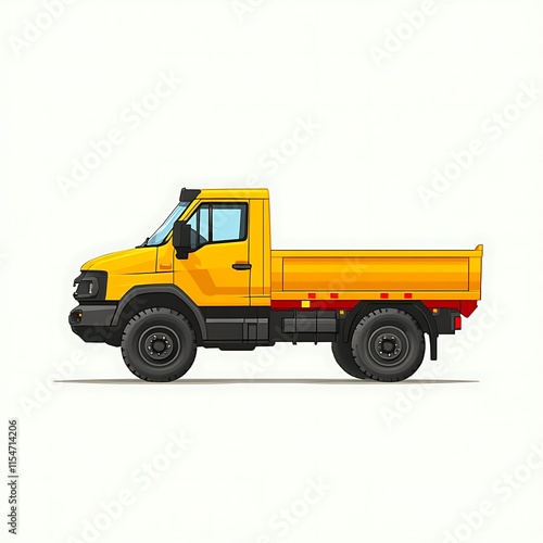 truck, yellow, dump, vehicle, transport, transportation, delivery, cargo, lorry, automotive, automobile, engine, wheel, tire, chassis, cab, bed, box, container, gear, drive, axle, suspension, brake, steering, mirror, headlamp, rear lamp, indicator, signal, bumper, side, profile, illustration, design, graphic, drawing, image, picture, model, rendering, isolated, background, white, colours, paint, metal