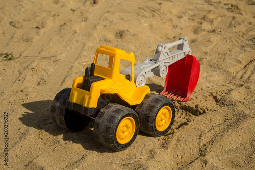 Yellow excavator toy in sand, on the beach. Boy's toys concept - Image