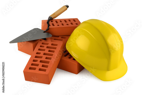 Yellow hard hat and trowel on orange bricks with glowing background construction