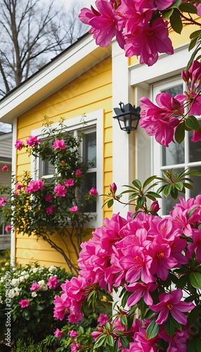 Yellow house exterior with spring blooming rhododendron, hyperrealism, with white tones