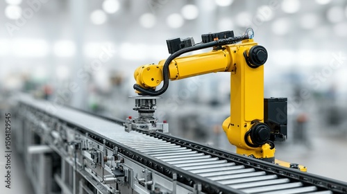 Yellow industrial robot arm on a conveyor belt in a modern factory.